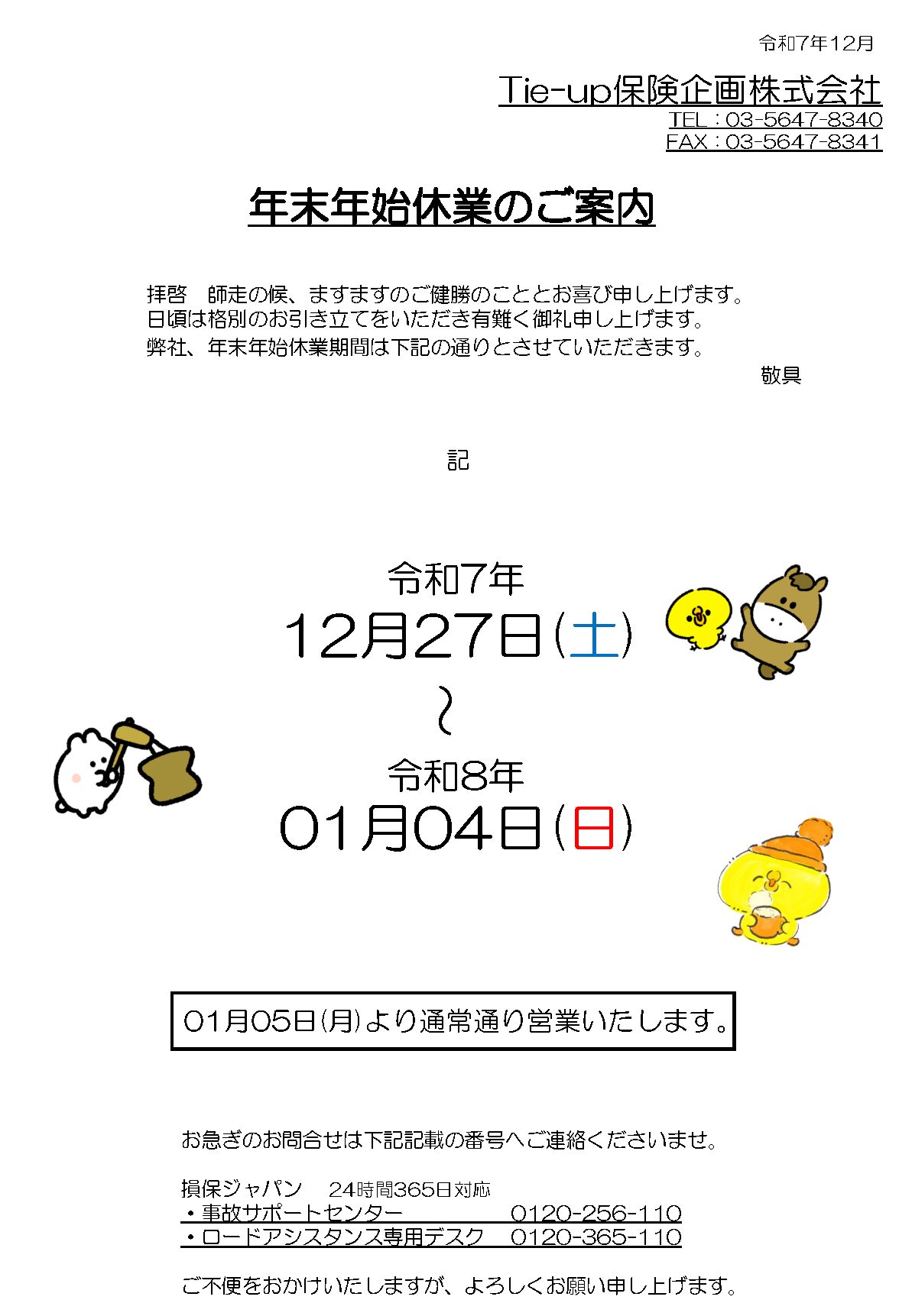 年末年始休業のご案内